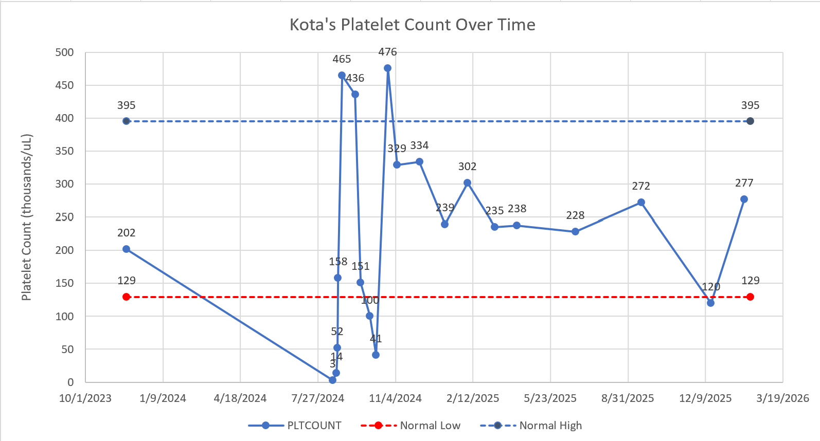 February 2025 update: Yet more continued good news. Kota's platelets are still within normal range and a bit higher than in January. Hopefully this means he can decrease his prednisone dose to 5mg going forward as he recently started having an eye issue diagnosed as corneal degeneration from long term prednisone use. Kota has a follow up appointment with the ophthalmology team later this month.